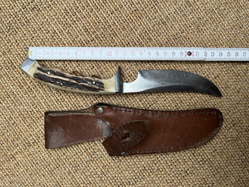 Kaum benutztes Jagdmesser "hand made" der Firma Wingen Solingen "Othello" mit ergonomisch geformtem Horngriff.