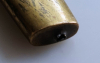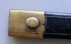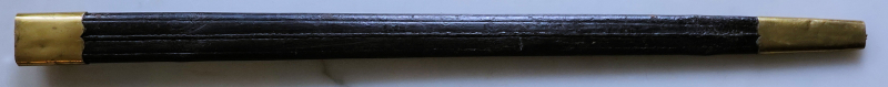 Lederscheide um 1850 mit Messingbeschlägen, Länge ca. 59 cm, die Naht ist geschlossen, im unteren Messingbeschlag ist ein Loch, Breite der Scheidenöffnung 32 mm