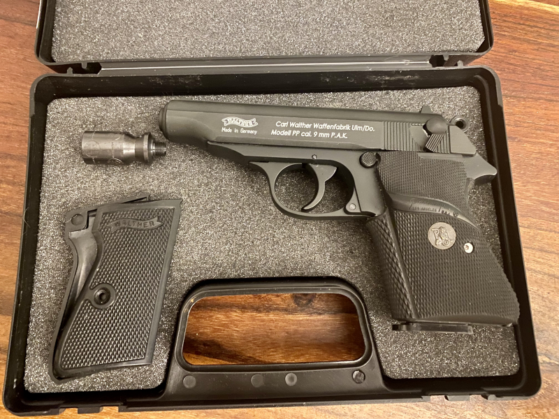 Verkaufe eine gebrauchte aber gut erhaltene und voll funktionsfähige Pistole, Walther - mod. PP im Kaliber 9mm PAK mit originalen Pachmayr- Griffschalen, den originalen Griffschalen und Abschussbecher. In der OVP! Die Pistole hat ein von außen poliertes Patronenlager.