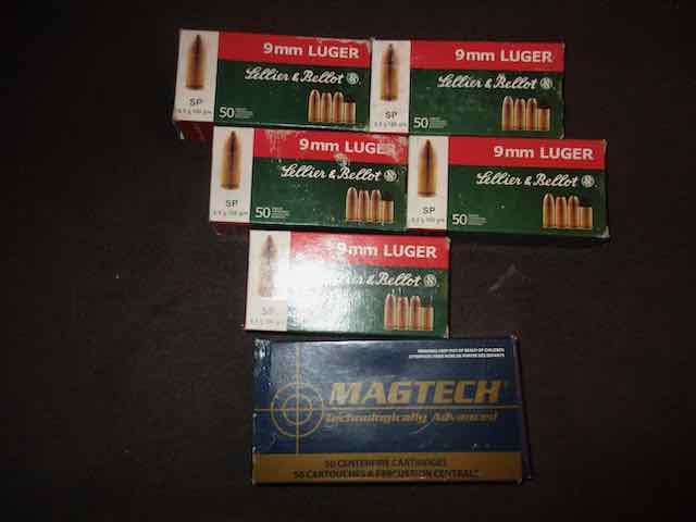 300 Patronen 9mmLuger (9mmPara). Davon 250 Stück, eine Fertigung, Sellier & Bellot, SP 6,5g/100grs und 50 Stück Magtech FMC, 8,03g/124gr. Kein Internationaler