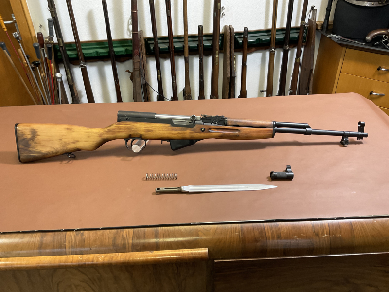 Zum Verkauf steht eine Selbstladebüchse SKS Simonov im Kaliber 7,62×39. Es handelt sich um ein Baujahr 1951 in sehr gepflegtem Arsenalzustand, importiert durch die Firma Schumacher.