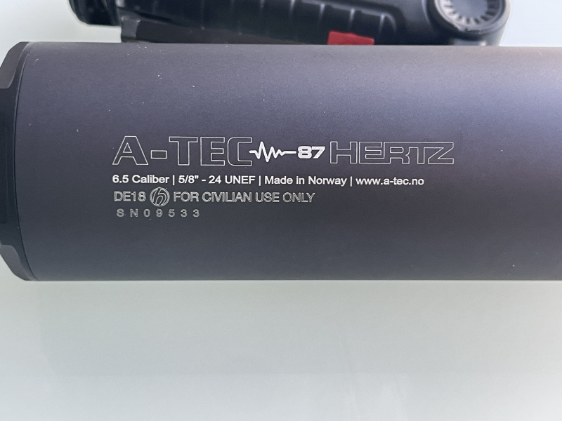 Schalldämpfer A-Tec 87 Hertz Kaliber 6.5, Gewinde 5/8"-24 UNEF. Dämpfer ist in gutem Zustand und wurde mit ca. 20 -30 Schuss belastet. Passend zur Büchse in meiner anderen Auktion. Privatverkauf ohne Garantie, Gewährleistung, Umtausch oder Rücknahme. Versand ausschließlich per Waffenkurier oder Abholung. Kann mit der Büchse zusammen versendet werden, wenn jemand beides ersteigert. Spart Versandkosten.