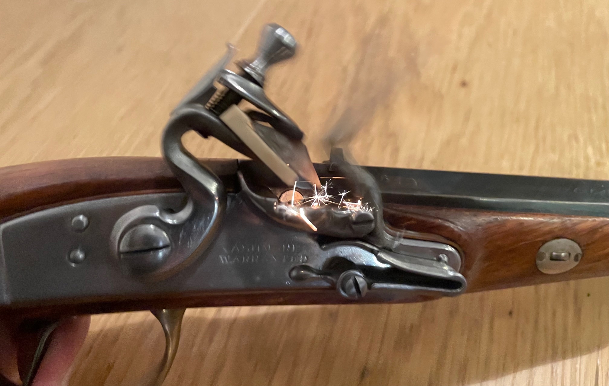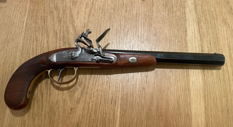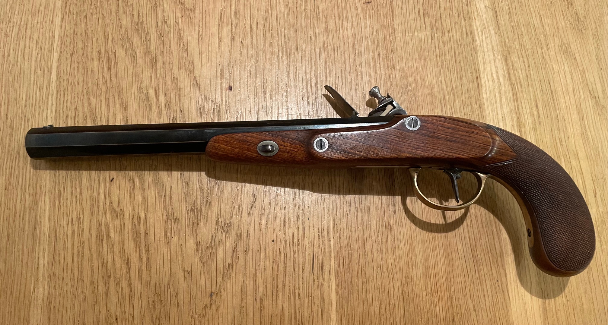 Versteigere eine guterhaltene Steinschloßpistole HW Mortimer&Son im Kaliber .45