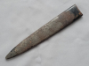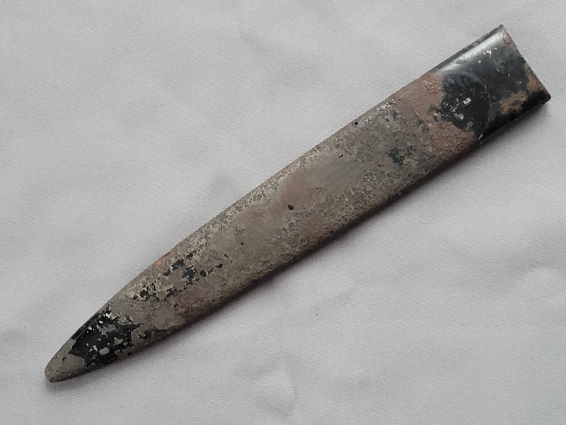 Originale Scheide zu einem XX Dienstdolch. Früher, guter Bodenfund. Einige kleine Löcher, auf einer Seite stärker korrodiert. Der Rost wurden bereits größtenteils beseitigt. Die Beschläge fehlen. Am oberen und unteren Ende beider Seiten ist noch die ursprüngliche schwarze Farbe vorhanden. Gute Basis für eine Restaurierung! Bitte sehen Sie auch die Bilder. Privatverkauf. Die Beschreibung erfolgt nach dem besten Wissen und Gewissen. Kein Umtausch, keine Rücknahme. - - - Sammlungsauflösung! - - - In meinen anderen Auktionen finden Sie verschiedene Ersatzteile für den Dienstdolch.