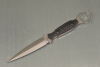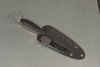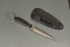 Sie bieten auf ein kleines Stiefelmesser (Boot Knife), das auch als Neckknife, also an einer Schnur um den Hals getragen werden kann. Es hat eine sehr schlanke, aber dennoch kräftige Dolchform und die Klinge ist extrem spitz. Der Griff besteht aus schwarzem G10, das mit roter Fiber unterlegt ist und hat einen Ringknauf, die Scheide aus schwarzem Kydex. Sie weist einen angeschraubten Stahlclip auf, mit dem sich das Messer gut am Hosenbund oder in der Jackentasche fixieren lässt. Schraubt man den Clip ab, kann man es gut an einer Schnur oder Kette um den Hals tragen. Das Messer sitzt fest in der Scheide, sodass man es problemlos mit dem Griff nach unten hängend tragen kann.