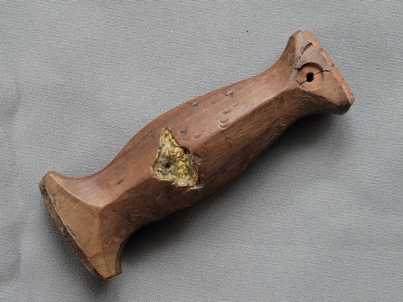 Originaler Griff für einen Dienstdolch der XA bzw. NXKK. Starke Tragespuren mit etlichen Drückern, vor allem auf der Vorderseite. Adler und Pastille fehlen. Der Griff wurde offenbar beim Herausbrechen der Pastille beschädigt, das Bruchstück aber wieder angeklebt. In der Aussparung für den Adler ist sehr viel alter Klebstoff vorhanden (Pattex?). Dieser Griff hat also schon einiges mitgemacht, aber er ist original. Privatverkauf. Die Beschreibung erfolgt nach dem besten Wissen und Gewissen. Kein Umtausch, keine Rücknahme. - - - Sammlungsauflösung! - - - In meinen anderen Auktionen finden Sie verschiedene Ersatzteile für den Dienstdolch.