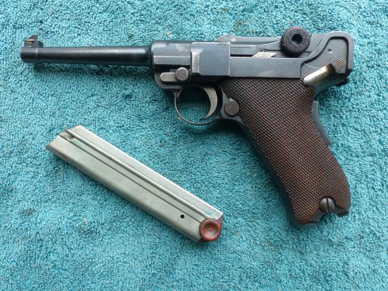 Schweizer Ordonnanzpistole DWM Kreuz im Strahlenkranz, Rework (06/1920),( 2001i ) 7,65 Luger, kein Neubeschuß, Verkauf nur an Händler oder Sammler (Rote WBK) , Zustand siehe Fotos, (Literatur siehe Faustfeuerwaffen der Eidgenossen, Horst Rutsch Seite 222) , Diese Reworks wurde von Hämmerl 1922 mit von der DWM Nachfolgefirma BKI zugekauften Neuteile und einem Hämmerlilauf zusammengebaut. Es wurden 51 Pistolen in 7,65 Luger und 49 in 9mm Luger hergestellt. Seriennummerbereich 2000 bis ca. 35500 mit Suffix i. Eine seltene Lugerpistole. Fragen an HBG GmbH Handelsgeselllschaft Horst Schenkel , hbg@schenkelnet.de, 0177 8167772, KEIN EXPORT