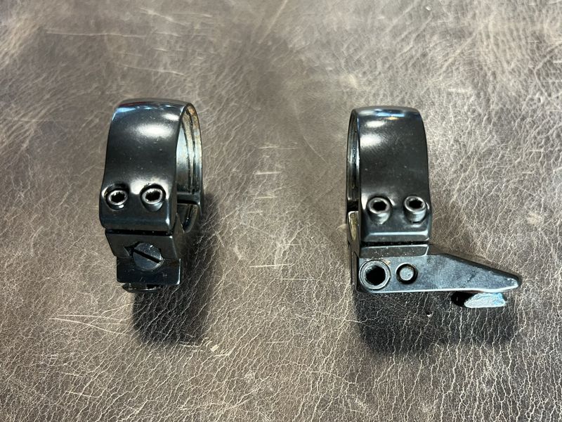 Stabile Stahlkonstruktion, klassisches EAW-Design, Vorder- und Hinterring mit Klemmschrauben. Die Ringe wurden auf einer Heym SR30 verwendet und sind voll funktionsfähig. Gebrauchsspuren vorhanden – siehe Fotos.