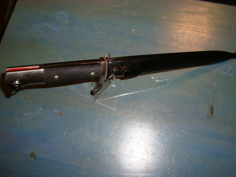 Aus meiner Schatzkiste biete ich an: Ein SG KS 98 in gutem Zustand, Griffschalen perfekt, keinerlei Abplatzungen, roter Filz anbei. Klinge topp, nicht beschliffen, auf der Fehlschärfe das PUMA-Zeichen geschlagen, darunter Solingen. Das Stossleder auch original. Die ungeöffnete Scheide mit Originallack, leichte Tragespuren vom Lederkoppelschuh, der leider nicht dabei, dieser war vom Kater zerbissen worden.