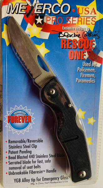 Das Einhandmesser Back Look Meyerco BLACKIE COLLINS Rescue One ist neu und befindet sich in einem einwandfreien Zustand. Es verfügt über eine arretierbare 8 cm lange Klinge und hat insgesamt eine Länge von 20 cm. Ein elegant gestaltetes Rettungsmesser mit einem Glasbrecher am Ende des Griffs, das außergewöhnlich leicht ist (100 g), einer abgeflachten Spitze (Schraubendreher) und einer gezackten Klinge zum mühelosen Durchtrennen von Gurten, neu.