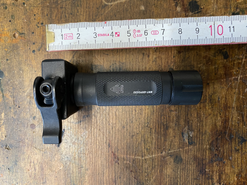 Der schwarz eloxierte Vordergriff aus Aluminium ist werkzeuglos abnehmbar. Außerdem hat er einen abschraubbaren Deckel auf einem Fach für Kleinteile, z.B. Batterie.