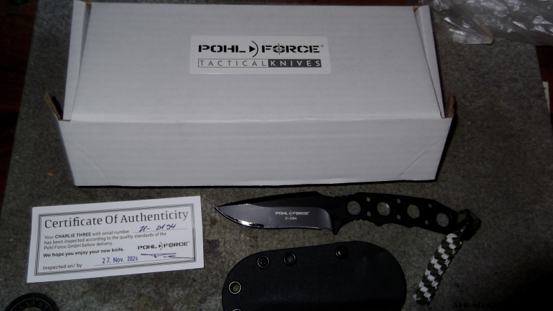 Verkaufe hier ein neues Pohl Force Charlie Three Messer mit Kydexscheide, Zertifikat und Ovp.Gesamtlänge ca. 20cm,Klingenlänge ca.8cm.