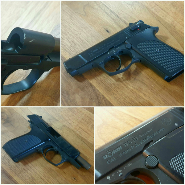 Röhm RG88 Brüniert Kal. 9mm P.A.K. PTB 670. Im Lieferumfang ist enthalten: Röhm RG88 Schreckschusspistole. Guter Zustand, voll funktionsfähig. Minimale Schwächungen am Kartuschenlager (siehe Bild). Kein Magazin enthalten, dieses ist jedoch bei jedem Schreckschusshändler günstig zu bekommen. Waffe hat das alte M10-Gewinde für den Abschussbecher. Dies ist ein Privatverkauf, ich übernehme keine Haftung, Rücknahme ist ausgeschlossen.