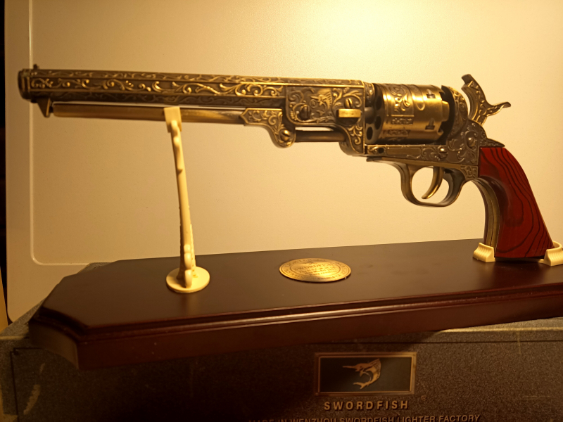 Biete hier einen Deko Revolver (Feuerzeug) von swordfish. in OVP in seher schönem zusatnd. Der Revolver hat eine Feuerzeug funktion (funktion nicht geprüft mangels Gas) Das Teil macht sich recht gut im Regal schöne Deko. Kommt mit ständer und OVP.