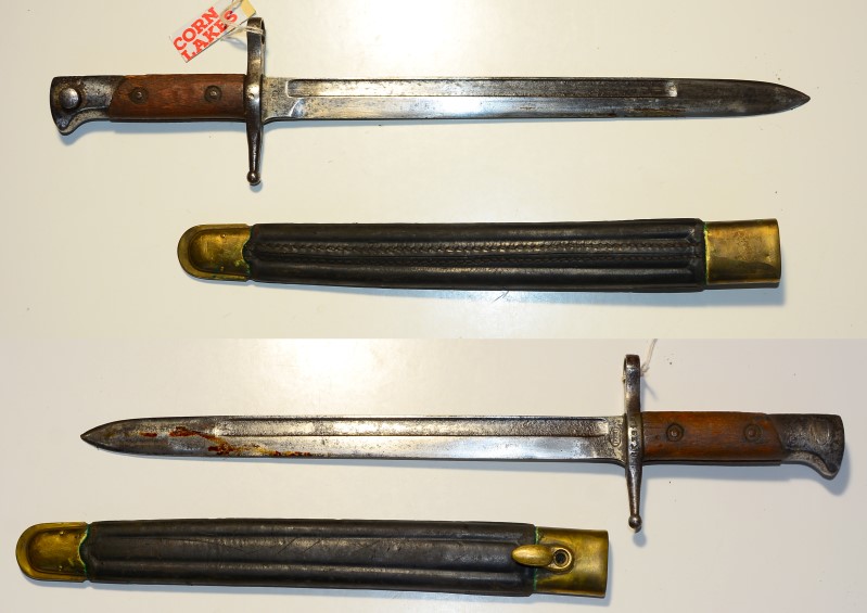 Italienisches Carcarno Bajonett Modell 1891, mit Lederscheide, Hersteller Terni, Eisenteile mit alten Roststellen, die Scheide sehr gut