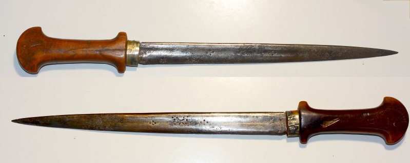 Afrikanischer Dolch mit 33,6 cm langer Klinge, Holzgriff, die Klinge mit Rostnarben, am Griff mitten ein Ausbruch, keine Scheide