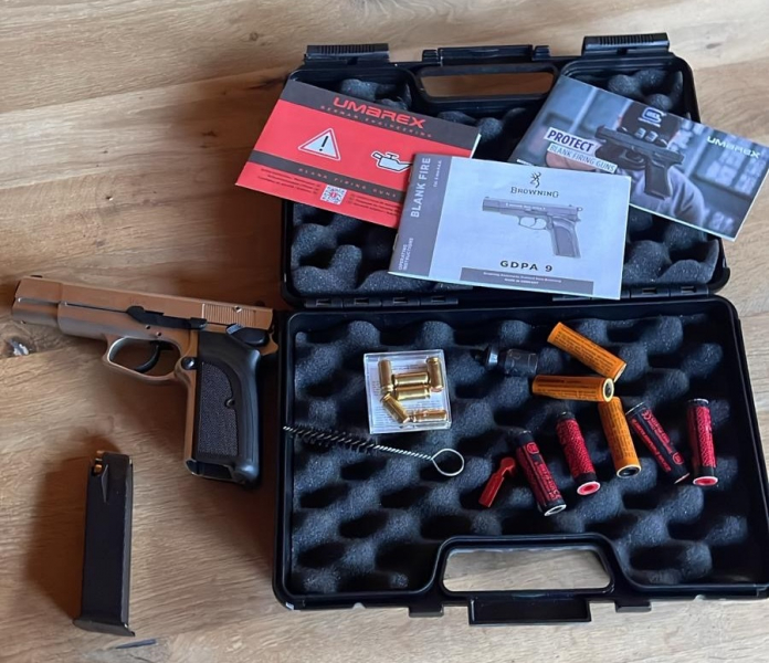 Ich biete hier eine Browning GPDA 9 9 mm P.A.K. silber Schreckschuss Pistole inklusive Zubehör. Browning GPDA 9 Schreckschuss Pistole 9 mm P.A.K – Klassisch inspirierte Schreckschuss Pistole mit robustem Design. Die Browning GPDA 9 Schreckschuss Pistole orientiert sich an der ikonischen Konstruktion von John Moses Browning und verbindet traditionelle Formgebung mit zuverlässiger moderner Technik. Als Hommage an die FN Browning High Power bietet sie ein präzises Handling und ein markantes Silber-Finish. Ideal für Anwender, die Wert auf klassische Optik und funktionale Ausstattung legen. Hochwertige Ausstattung für sichere Bedienung Die GPDA 9 verfügt über einen Spannabzug, einen funktionierenden Schlittenfanghebel sowie eine Fallsicherung, die eine sichere Nutzung in unterschiedlichen Situationen unterstützt. Der beidseitige Entspannhebel ermöglicht eine komfortable Bedienung für Rechts- und Linkshänder. Die robuste Konstruktion ist auf zuverlässige Abläufe und langlebige Nutzung. Nur selten benutzt, daher super Zustand.