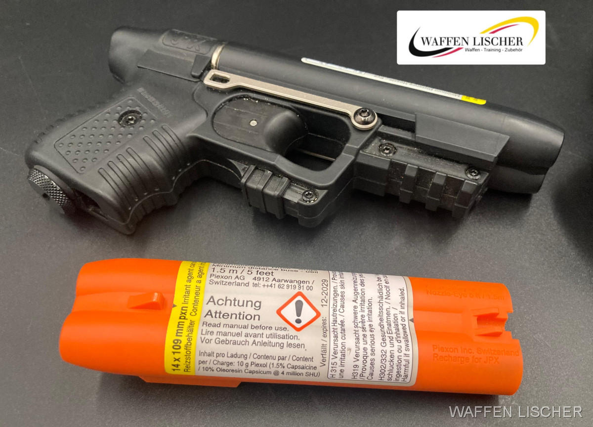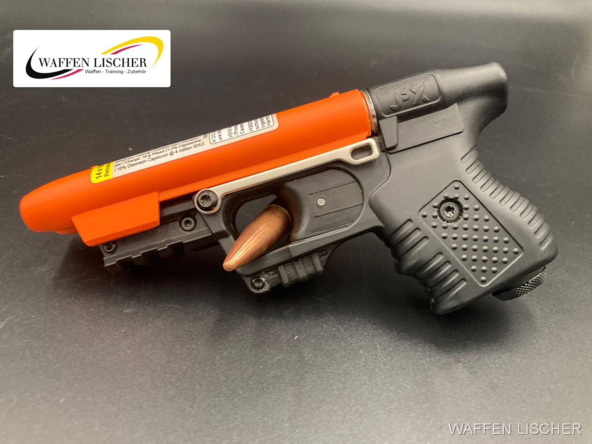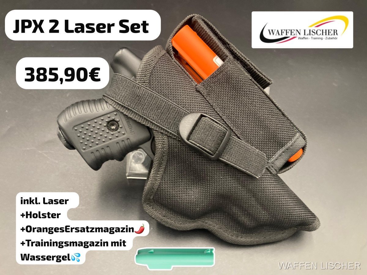 Bestandteil der Auktion ist der JPX2 Laser mit Box und zwei Pfeffer Kartuschen eine in schwarz eine in signalorange sowie einem Holster und einer blauen Trainingskartusche