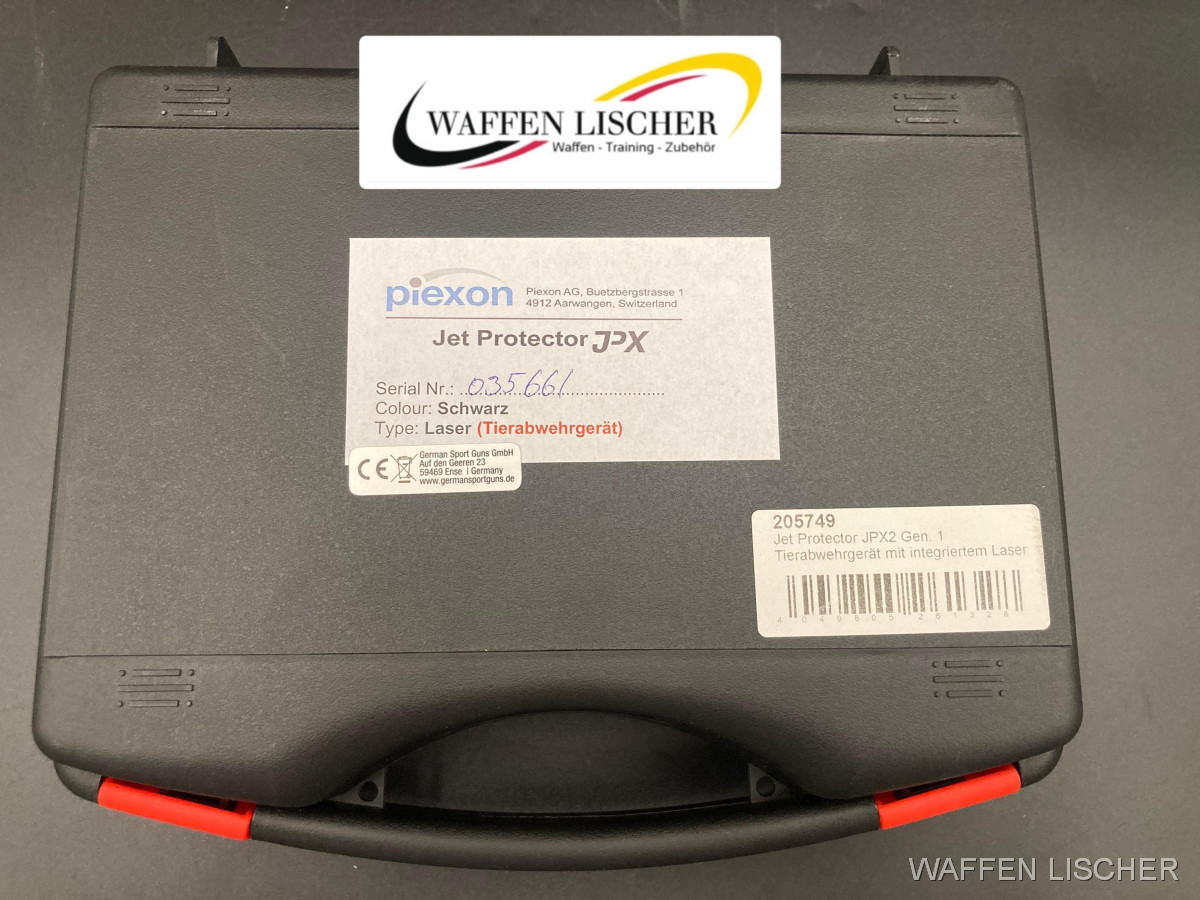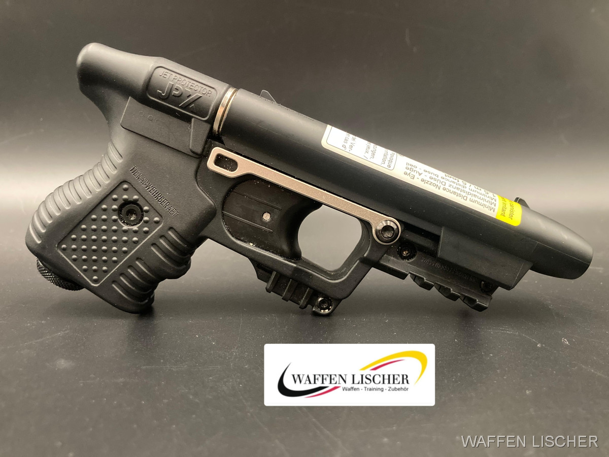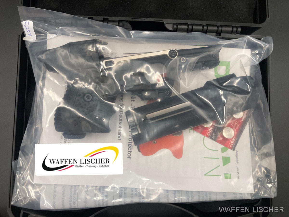 Bestandteil der Auktion ist der JPX2 Laser mit Box und zwei Pfeffer Kartuschen eine in schwarz eine in signalorange sowie einem Holster und einer blauen Trainingskartusche