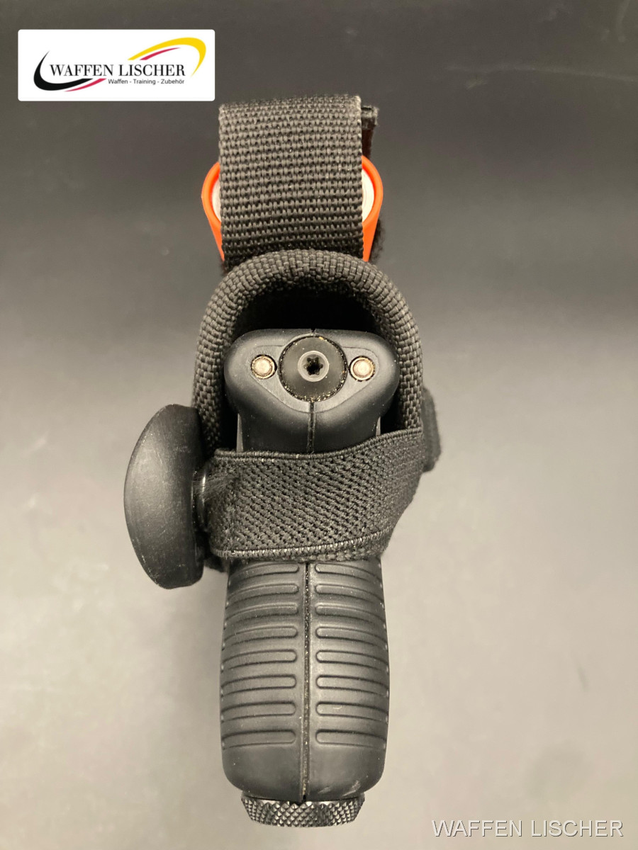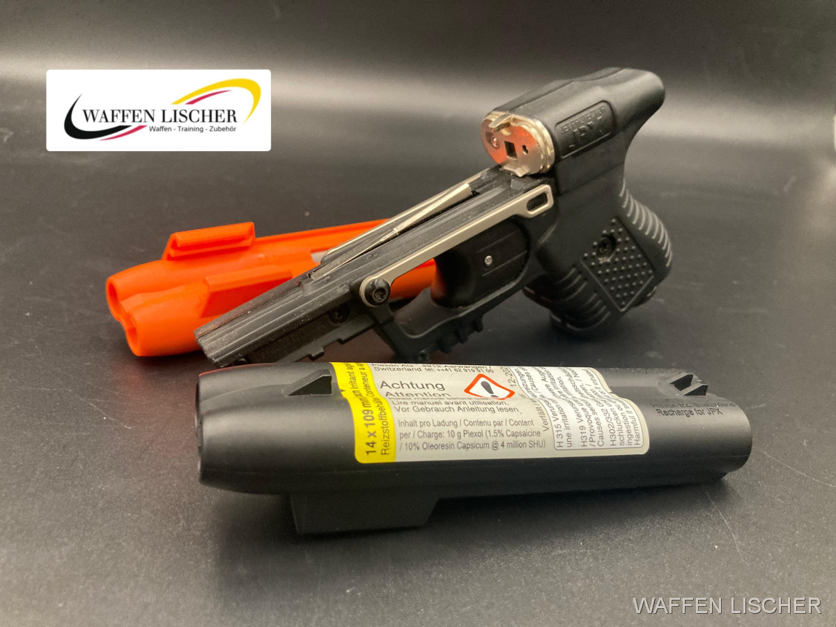 Die orangene Kartusche ist zu empfehlen, wenn das Gerät in der Öffentlichkeit getragen werden muss um sich evtl. gegen agressive Hunde verteidigen zu können. Hier signalisiert das Orange entreffenden Einsatkräften, dass es sich NICHT um eine Schusswaffe handelt. (Regeln der Waffenverbotszonen beachten-Rechtlich ist der PIEXON ein Spray)