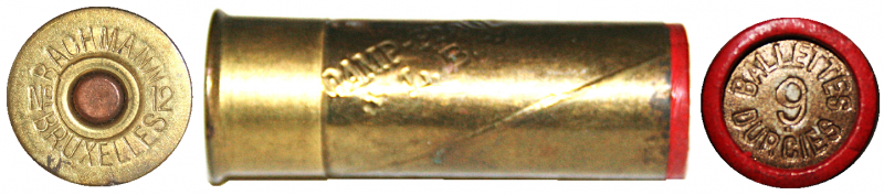 Sie bieten auf eine alte Schrotpatrone Kaliber 12 von Bachmann in Brüssel. Sie hat eine Hülse aus gewickeltem Messingblech und ist mit 9mm Posten geladen. Weiteres siehe Fotos, sie zeigen die Patrone aus dieser Auktion. Privatverkauf aus Sammlungsauflösung.