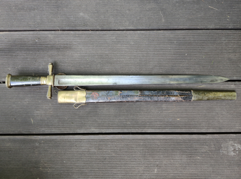 Original Jagdplatte ca 18 Jahrhundert in einem dem Alter entsprechendem guten Zustand mit originaler Scheide aus dem Haushalt des Oberjägers Ponta der in der Schorfheide angestellt war.