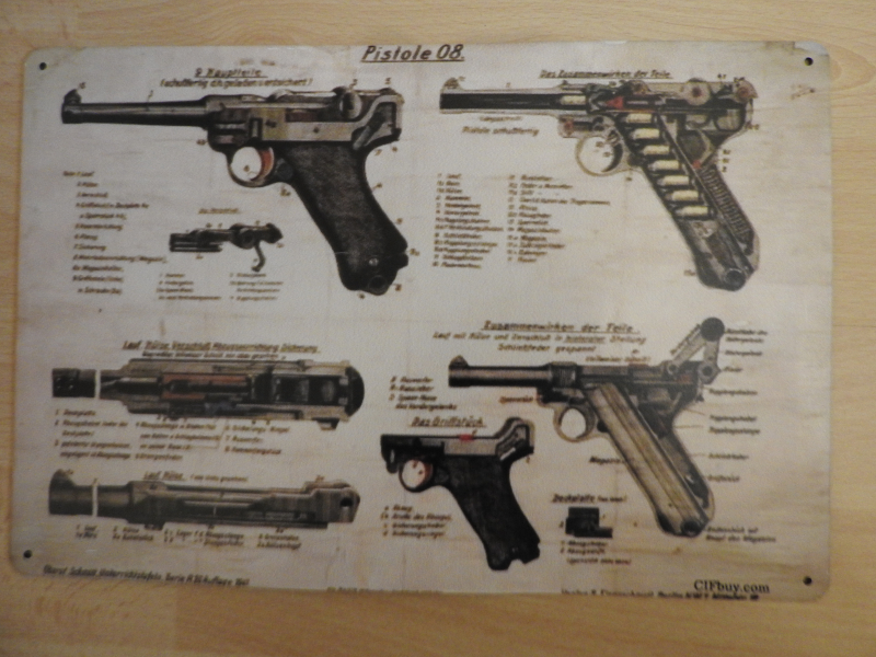 Biete ein Blech-Dekoschild mir diversen Schnittzeichnungen der Pistole Luger 08. Das Schild ist wahrscheinlich im Siebdruckverfahren hergestellt und hat eine Größe von 20 x 30 cm. Die Ecken sind abgerundet und haben Bohrungen zur Befestigung. Alter und Herkunft des Schildes sind mir nicht bekannt.