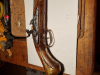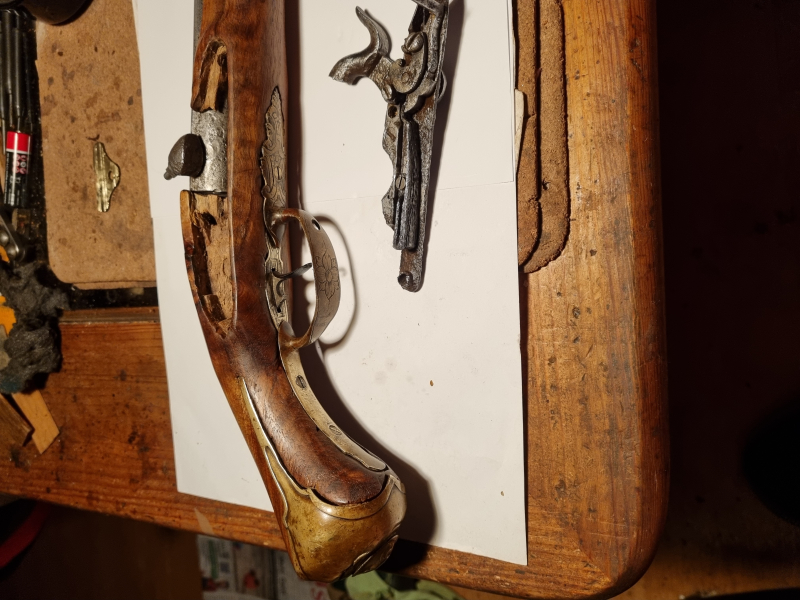 Perkussionspistole unbekannt. Wohl aus dem baltischen Raum. Russland, Norwegen, Dänemark usw. Schaft aus Birkenholz,. Schwere Militärpistole, Gesamt: 46,5cm, Lauf: 29cm, Cal. 16mm, Hahn hält nur auf Feuerposition, Glatter oben eckiger Lauf unten rund.