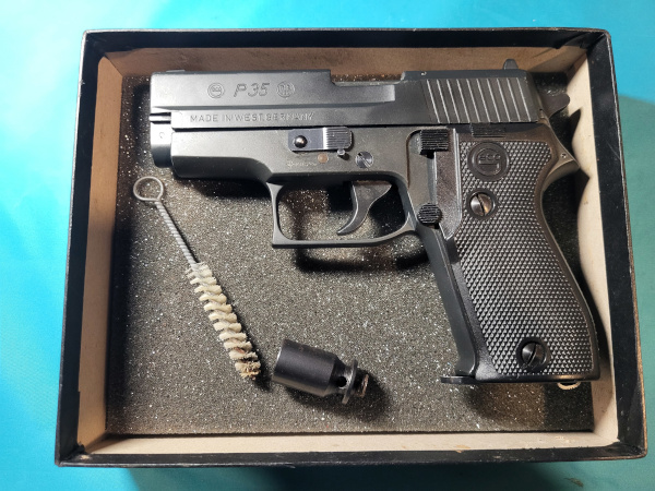 Sie Kaufen eine Neuwertige GECO Pistole Modell P36 im starken Caliber 35, Original Verpackung (mit Gebrauchsspuren) Abschussbecher und Bürste anbei.