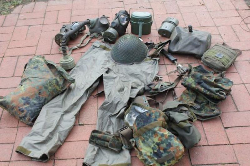 Zelt , Bekleidung, Masken, Helm, Trinkflasche usw.