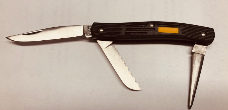 Das Imperial Knife Schrade Tradesman #TM4 Utility-Taschenmesser mit Slip-Point-Klingenmechanismus verfügt über drei Werkzeuge: eine vier Zentimeter lange, äußerst scharfe Klinge mit Wellenschliff, eine herkömmliche, sechs Zentimeter lange Klinge sowie eine Ahle zur Bearbeitung von Leder und vergleichbaren Materialien. Die Lieferung erfolgt in der Originalverpackung.
