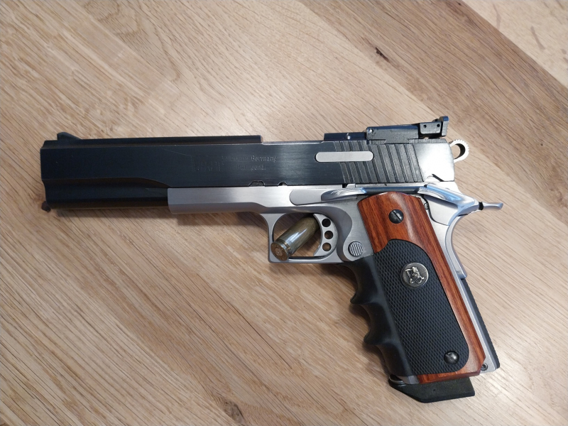 Peters Stahl, 6Zoll, 1911er, .45ACP in Duotone mit Pachayr Griffschalen, einstellbarem Visier und zwei Magazinen.