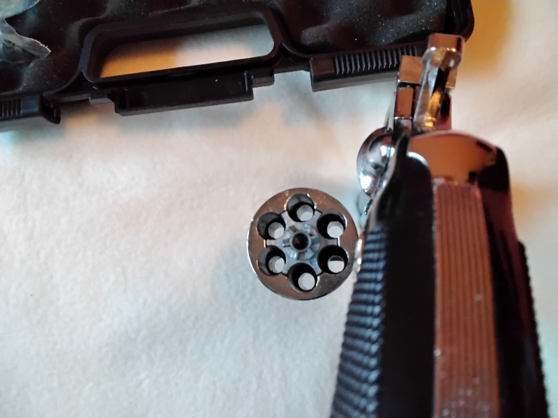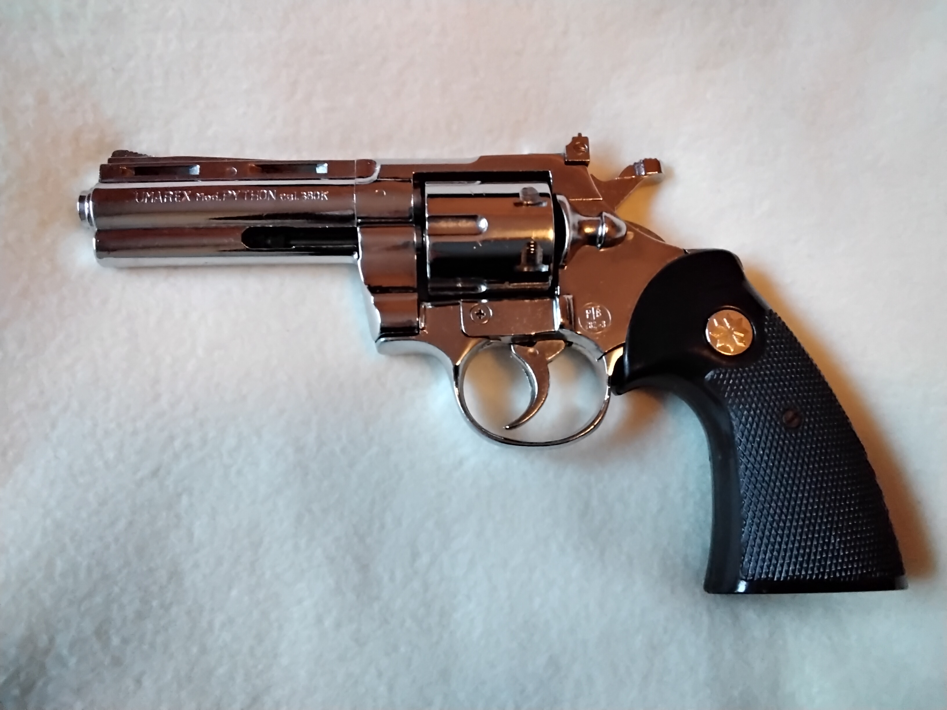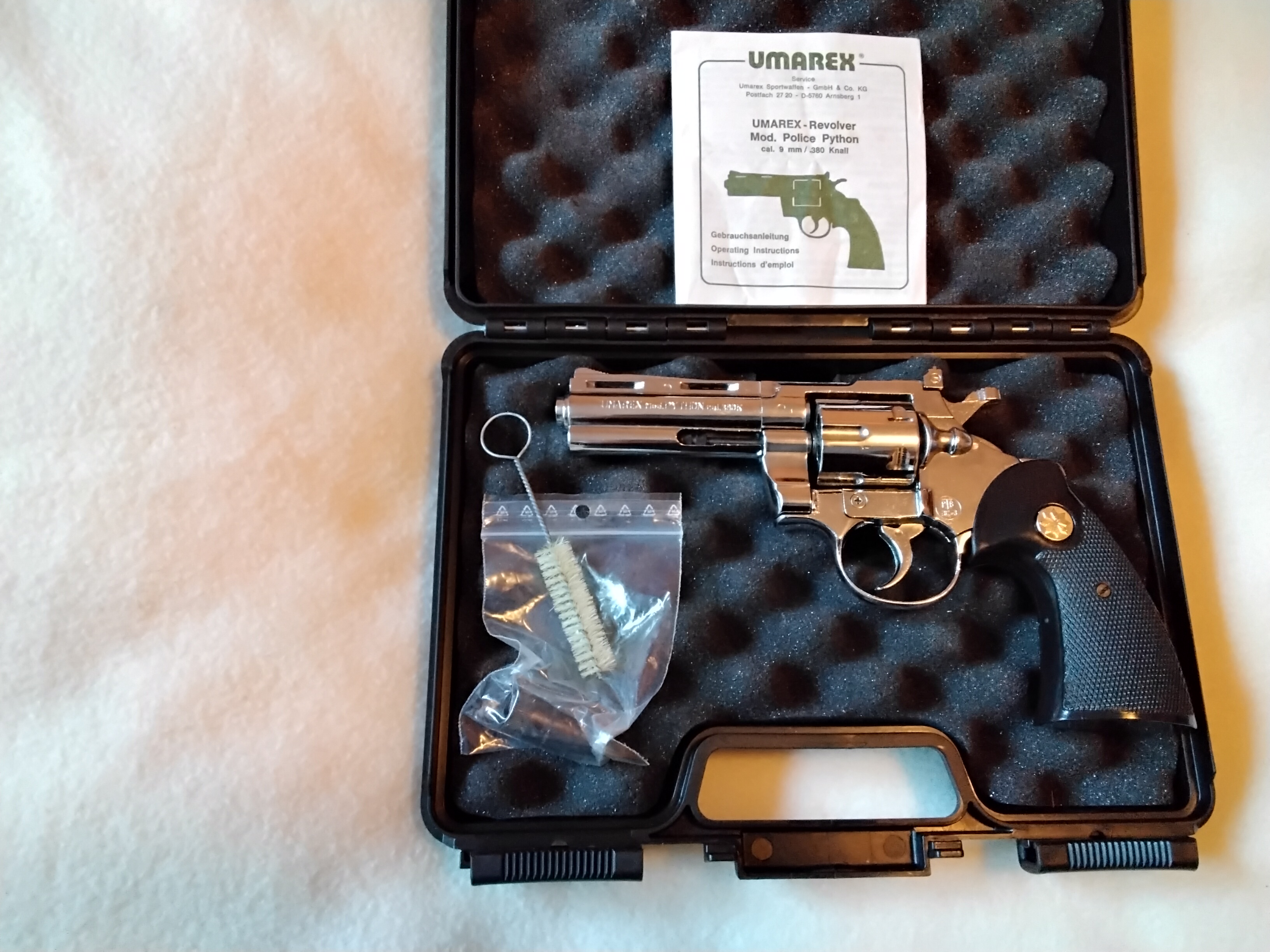Es handelt sich um die Chromausführung des Colt Python, enthalten sind im Set Abschußbecher, Anleitung, Putzbürste und ein stabiler Waffenkoffer.