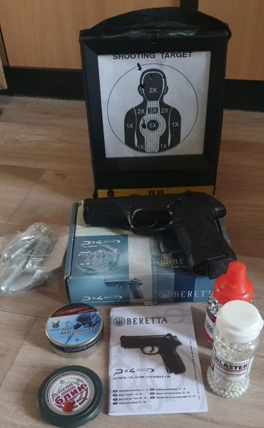 Biete eine kaum benutzte Beretta CO2 Pistole Px4 Storm mit 3 CO2 Kapseln 12 g + 500 Diabolos, 50 Knall Diabolo, 1500 Stahl BBs und ca. 900 Plastik BBs.