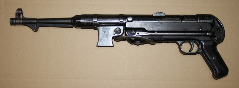 Einmalige und wohl letzte Gelegenheit auf eine 100% originale, frühe Schmeisser MP40 "fxo" im Kal. 9x19. Mit orig. Lauf und Verschluss! Kein aufgearbeiteter ehemaliger Dekoteilesatz. Gesetzeskonformer Umbau auf Semi Auto durch die Firma Niedermeier in München. Auch der Zustand ist original mit leichten Gebrauchsspuren. Teils noch altes Fett von der Einlagerung. Siehe Bilder. Der Lauf ist etwas matt, hat aber gutes Profil. Funktion einwandfrei. Lieferung inkl. 10er Magazin.