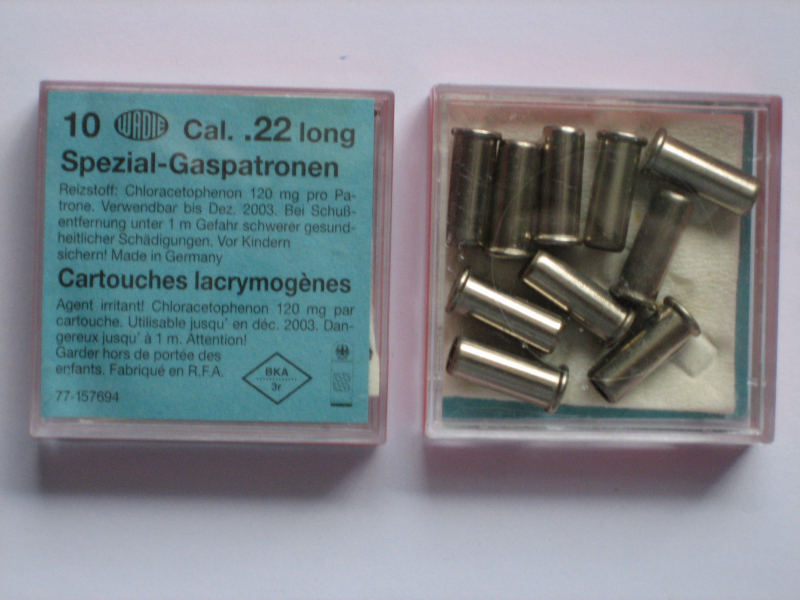 Sie werden nicht mehr oft angeboten aber es gibt sie noch ++ Aus Nachlass werden 10 Stk. (1 Packung) starke Spezial-Gaspatronen Cal. .22 long vom Hersteller WADI (Haltbarkeitsdatum 12/2003) angeboten -- Die Patronen sind noch original verpackt und waren trocken gelagert -- Die Patronen sind mit 120 mg Chloracetophenon geladen -- Die Versandkosten als Einwurf-Einschreiben betragen 5,60 € +++ Beim Kauf von 2 Packungen fallen nur 1x Versandkosten an +++ Privatverkauf, daher keine Gewährleistung, Garantie oder Rücknahme. ++ Altersnachweis/ eGun ID ist erforderlich +++ Fragen bitte mailen.