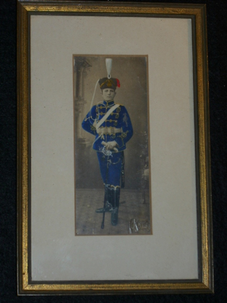 Foto / von Husar Konrad Geisler im 7. Königs Husaren Regiment (Bonn) 25.3.1892 siehe Rückseite , Die Husaren Uniform (blau - weiss) ist mit Oelfarbe per Handarbeit gemalt worden, der Rest ist schwarz-weiss Foto, ca.12x17 cm , das Kabinettfoto 11x4 cm, guter Zustand
