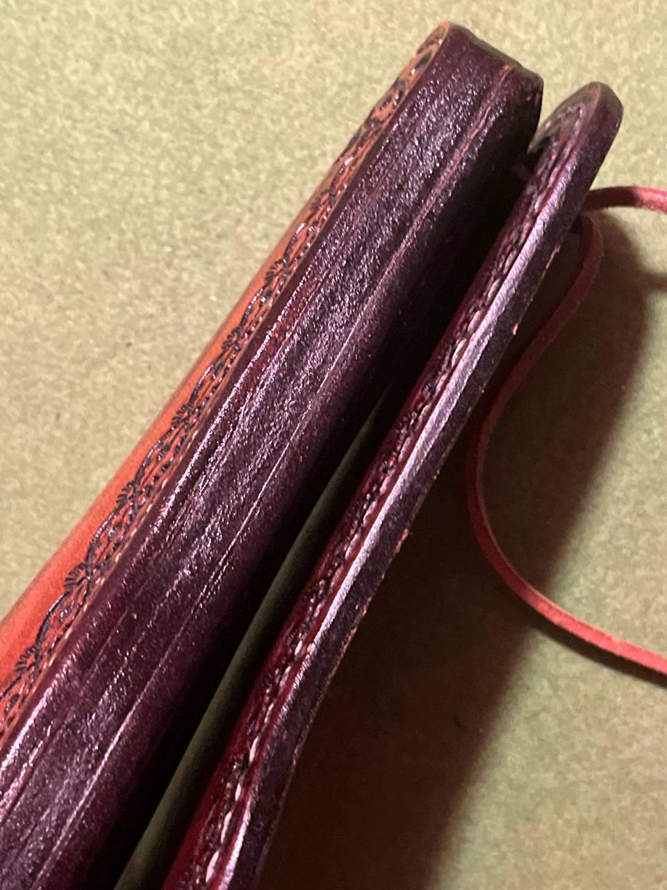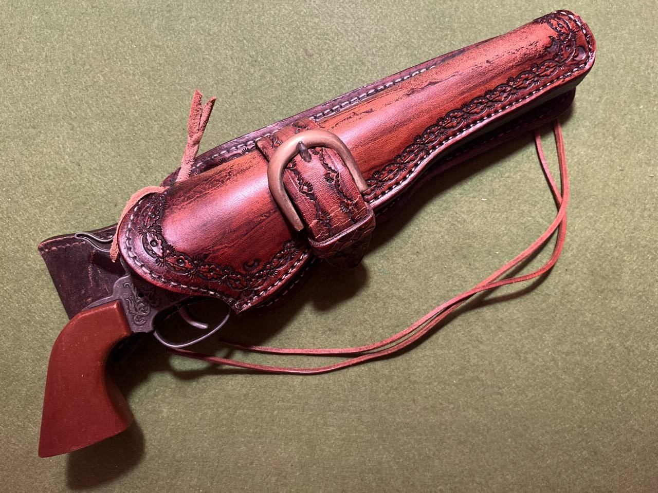 schönes verziertes, aufklappbares Gürtelholster aus in Holzoptik gemasertem Sattelleder, mit der riesigen Gurtelschlaufe kann man auch,