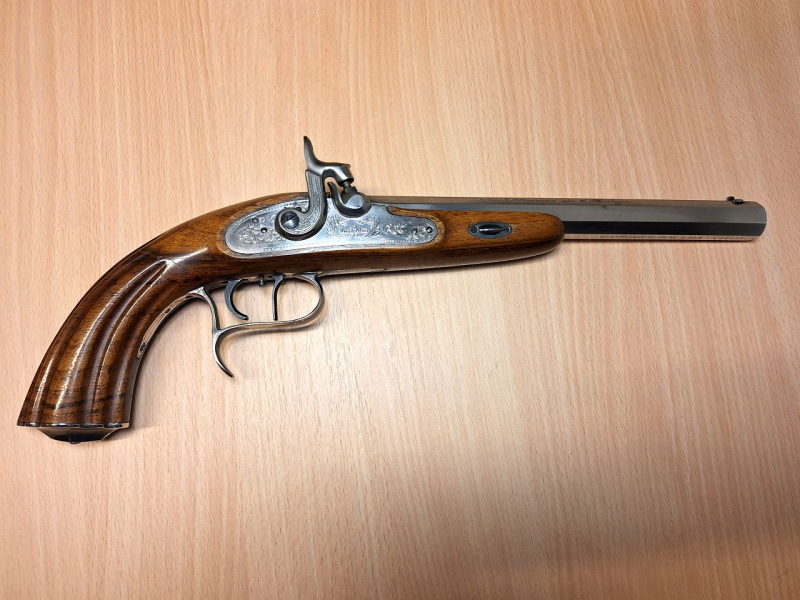 Zur Auktion biete ich eine Perkussionspistole Le Page im Kaliber .45 von Armi Sport an. Diese schöne Pistole ist aus einem Nachlass. Die Funktion des Perkussionsschloß und des einstellbaren Stecher ist einwandfrei. Für ihr Alter von ca. 30 jahren, ist der Zustand gut wie man auf den Fotos sehen kann. Gebrauchspuren sind vorhanden siehe Fotos. Rost ist am Lauf und an den anderen Metallteilen nicht vorhanden. Der Schaft hat keine Risse nur Gebrauchsspuren siehe Fotos. Die Fotos sind Bestandteil der Auktion.