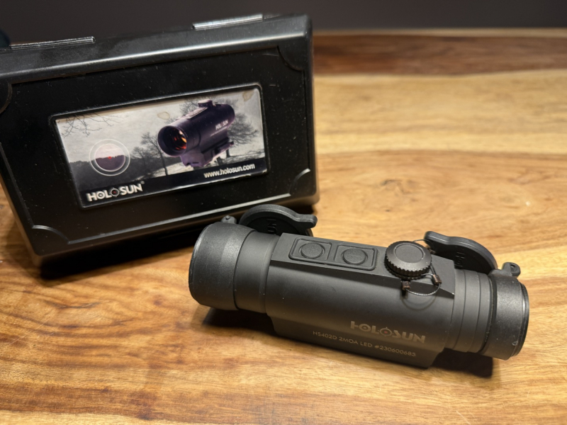 Zum Verkauf steht ein Holosun 402D Red Dot, das durch seine schnelle Zielerfassung und klare Punktabbildung überzeugt.