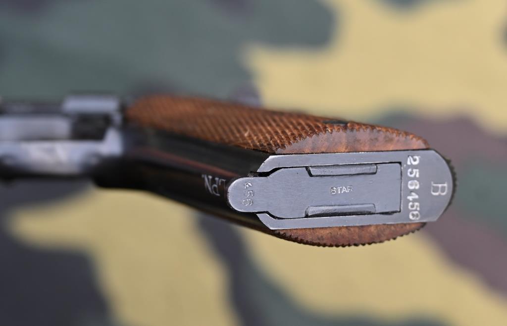 Gültige spanische Beschusszeichen, Herstellerschriftzug, Seriennummer "256456" auf der Griffstückunterseite neben Modellangabe "B", auf auf sehr vielen Teilen Endziffern "456", auf der Griffstückvorderseite ehemaliger Eigentumsstempel "LPN." der Landespolizei Niedersachsen: Polizeiversionen dieser Pistole zeigen deutlich mehr Benummerungen der Kleinteile als zivile Modelle. Kaliberangabe "CAL 9 mm" und "F Patr 08" links auf dem Schlitten. "Cal. 08" auf dem Patronenlager, neben Seriennummer und gültigen spanischen Beschusszeichen, codiert-datiert "O" = 1944.