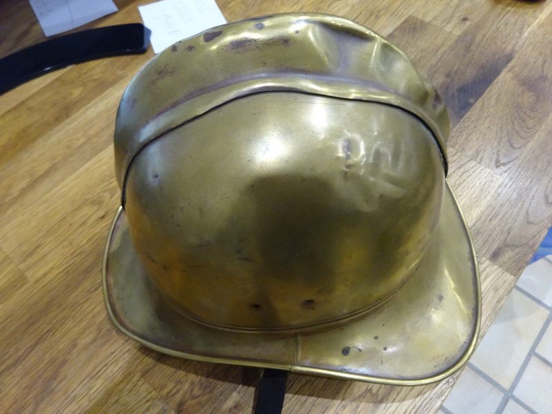 originaler Messinghelm Feuerwehr Elsässer Form um 1875/80 - aufgesetzter hoher Messingkamm -mit Innenleder, deutliche Tragespuren (Dellen), aber bei dem Alter irgendwie charmant, daher preiswert