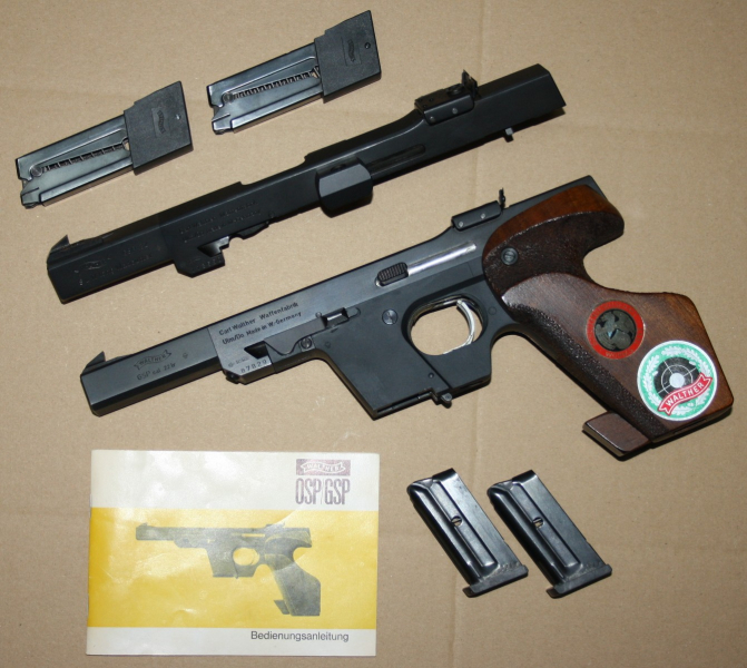 Aus gepflegtem Erstbesitz stammt diese Walther GSP im Kal. .32 S&W long WC und das dazugehörige Wechselsystem im Kal. .22lfb. Jeweils mit 2 Magazinen. Läufe und Funktion einwandfrei.
