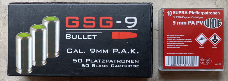 Hier verkaufe ich 50 Kartuschen 9mm PAK von GSG 9-BULLET ------ und 10 SUPRA Pfefferpatronen (120 mg. ) haltbar bis : 12 / 2029 ----