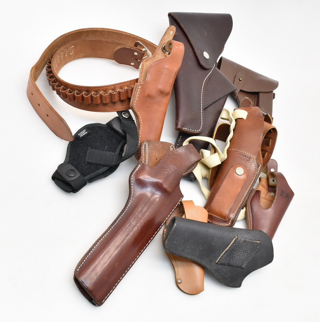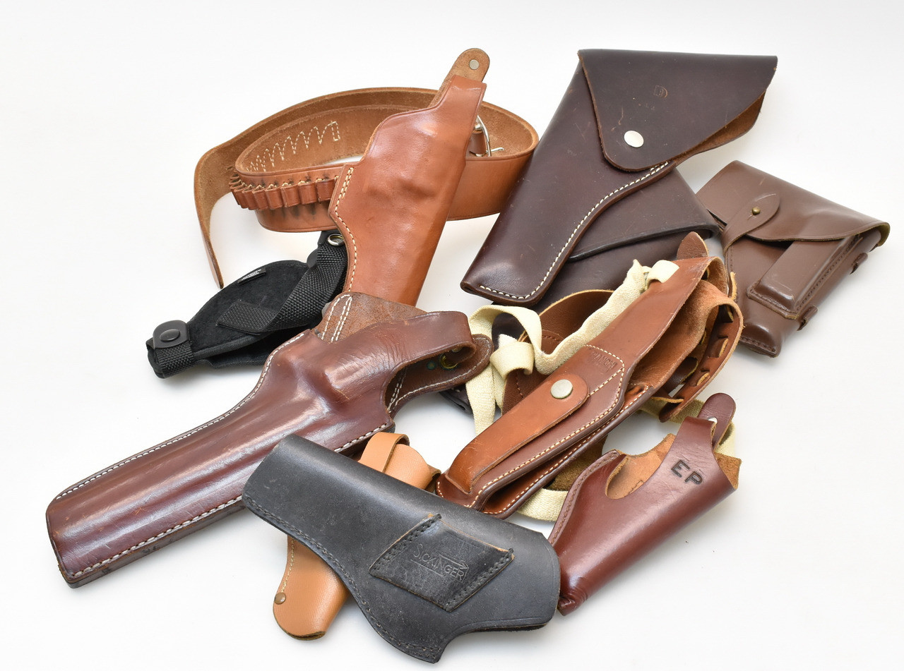 Hersteller und welche Größe für welche Waffe passend ist nicht bekannt. Insgesamt 10 Holster und 1 Gürtel.
