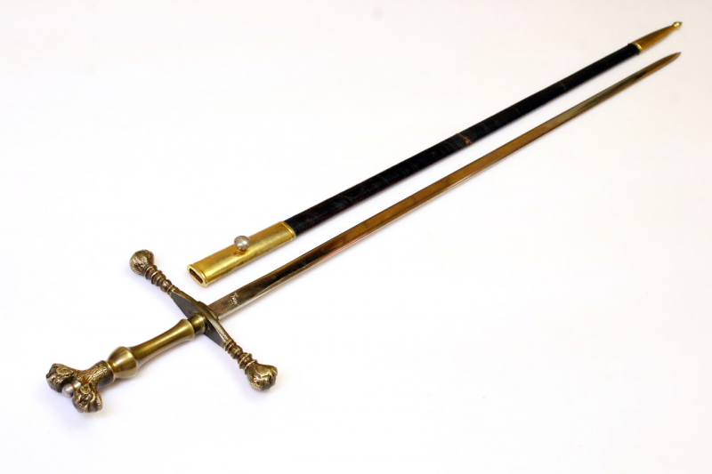 Anm.: Die Ausführung des Degens lässt vermuten das das Stück möglicherweise bei Ritualen getragen wurde um Dämonen bzw. schädlichen Zauber abzuschrecken.