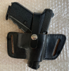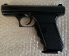 Nachbau der HK P7 von Umarex in Lizenz. Beschriftung Heckler und Koch, Waffe wurde Mitte der 80er Jahre gekauft und nur 2 Schuss Probe geschossen. Das Echtlederholster ist ein original P7 Holster, der Halteriemen wurde gekürzt um für sicheren Halt zu sorgen. Das zweite Magazin (siehe Bild) dient evtl. als Ersatzteilspender, der Boden ist gebrochen. Alles Andere ist noch gut verwertbar. Die Pistole hat Kaliber 9mm P.A.K. und funktioniert "trocken" einwandfrei.