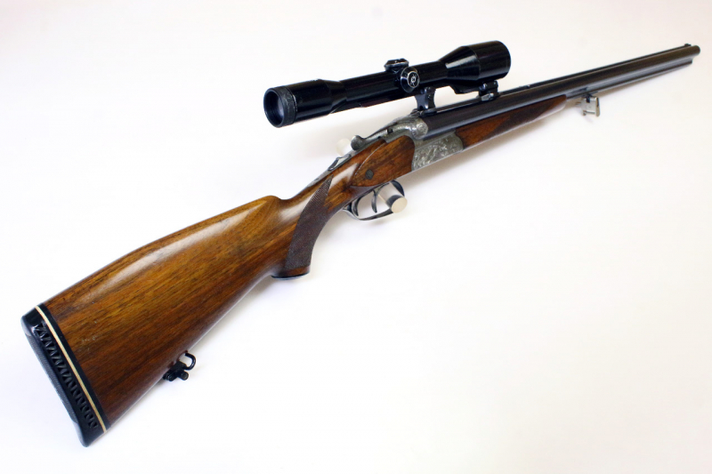 - Nussholzschaft, gummierte Schaftkappe, Fischhautverschnitt am Griff & Vorderschaft, deutsche Backe, Riemenbügel