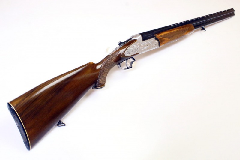 - Stainless-Steel Basküle mit floralen Dekor graviert, umrahmt von Arabesken/Rocaillen; Kolbenhalssicherung, Doppelzüngelabzug, Waffe schließt sauber & spiellos