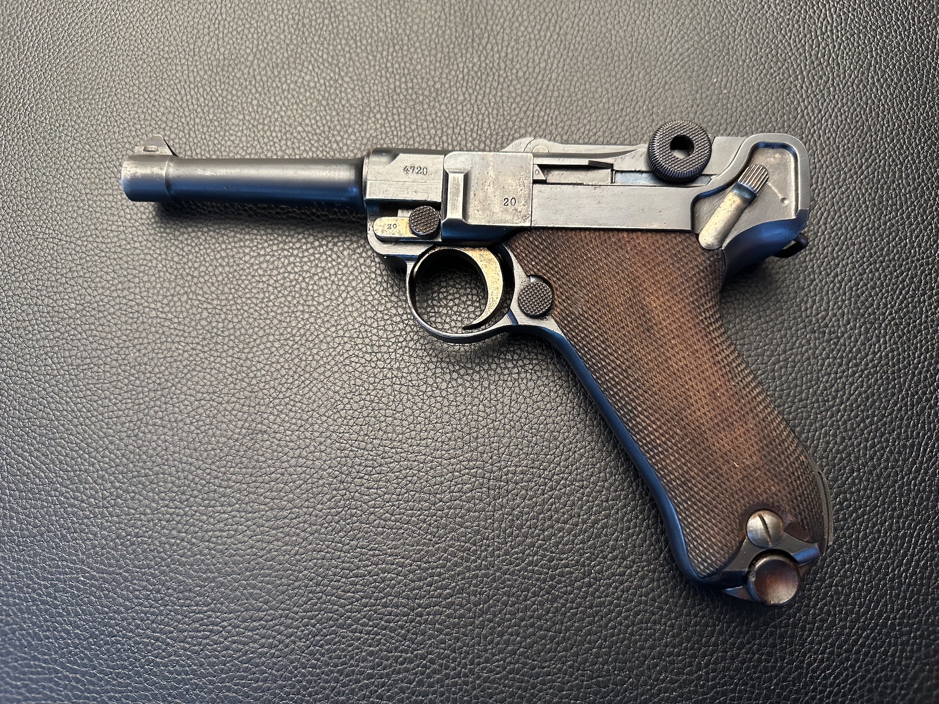 Verkaufe Pistole P08 DWM Erfurt 1916 in 9 mm Luger- sehr guter Zustand nummerngleich mit Holster, Werkzeug und 2 Magazinen. Zustand und Beschusszeichen siehe Bilder. Bei weiteren Fragen einfach mailen. Da Privatverkauf, keine Rücknnahme, keine Garantie. Weitere Bilder auf Anfrage. Erwerbsberichtigung erforderlich. Abholung und Besichtigung nach vorheriger Terminabsprache möglich.